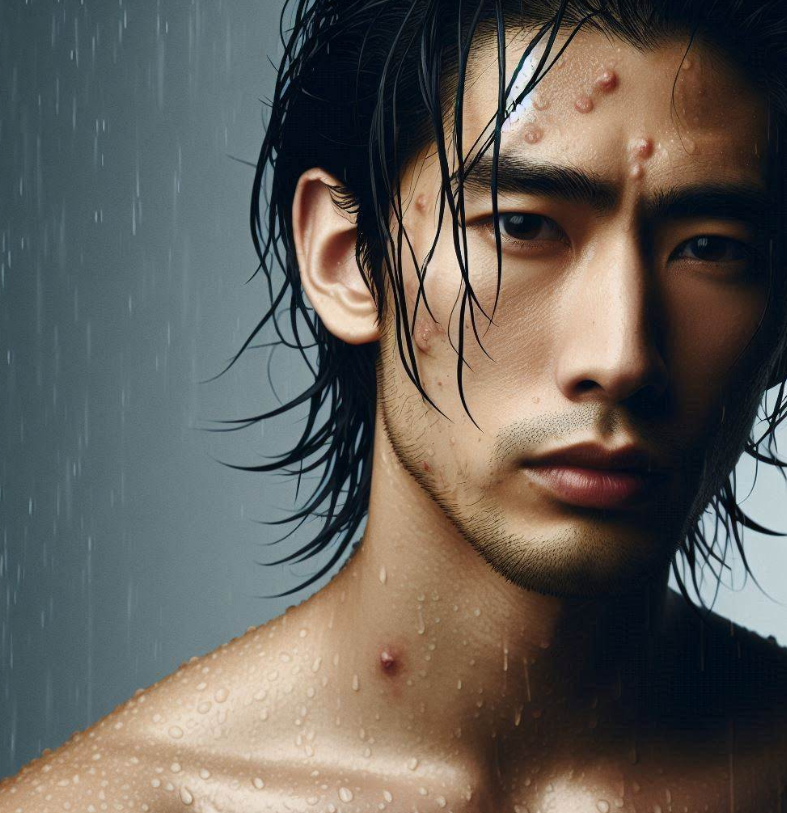 Persona con el pelo mojado, resfriado y un pañuelo en la nariz