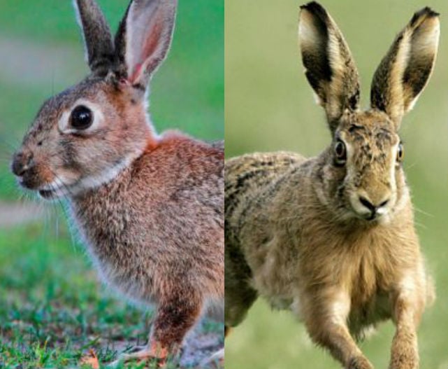 Es muy difícil distinguir entre los dos, pero es posible. Las liebres son un poco más pequeñas que los conejos, tienen orejas más cortas y tienden a esconderse en sus madrigueras. A los conejos, sin embargo, les gusta vivir peligrosamente y tratar de dejar atrás a sus atacantes.