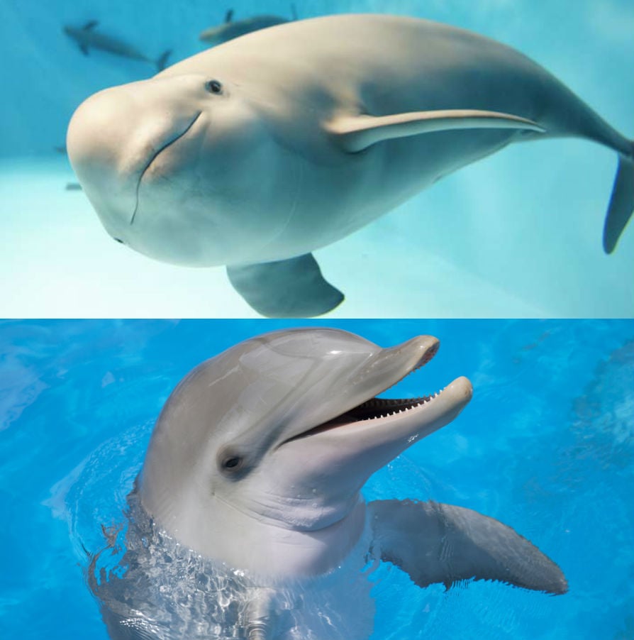 Si te fijas bien en las aletas, la forma del cuerpo y la cabeza, podrás saber cuál es. Las marsopas tienen una boca mucho más pequeña, un cuerpo más grueso y una aleta dorsal triangular, a diferencia del hocico más largo, el cuerpo más delgado y la aleta dorsal curva del delfín.