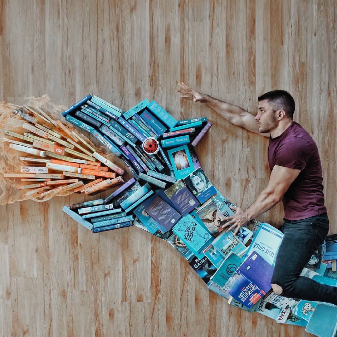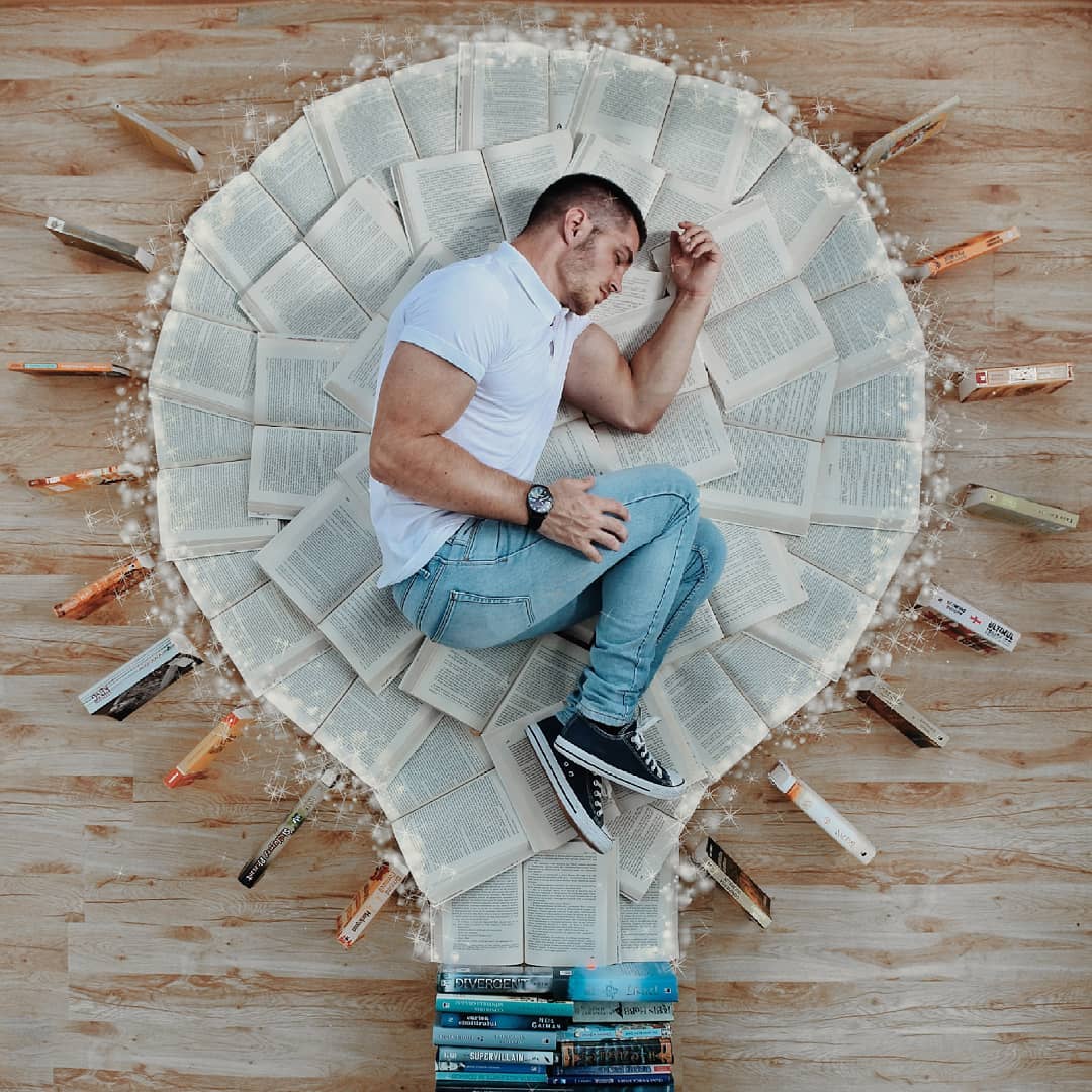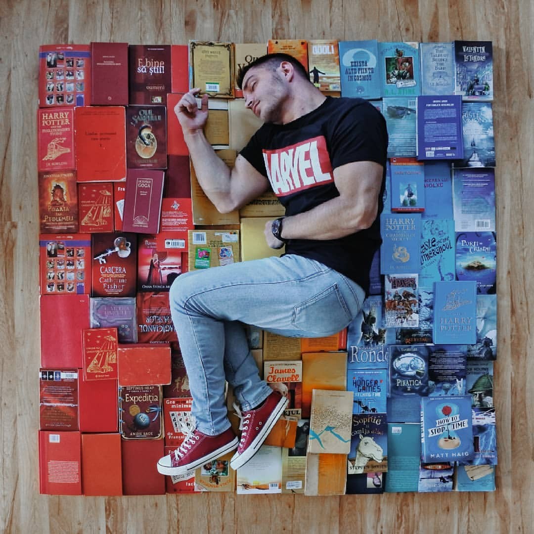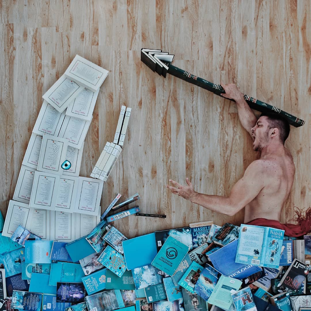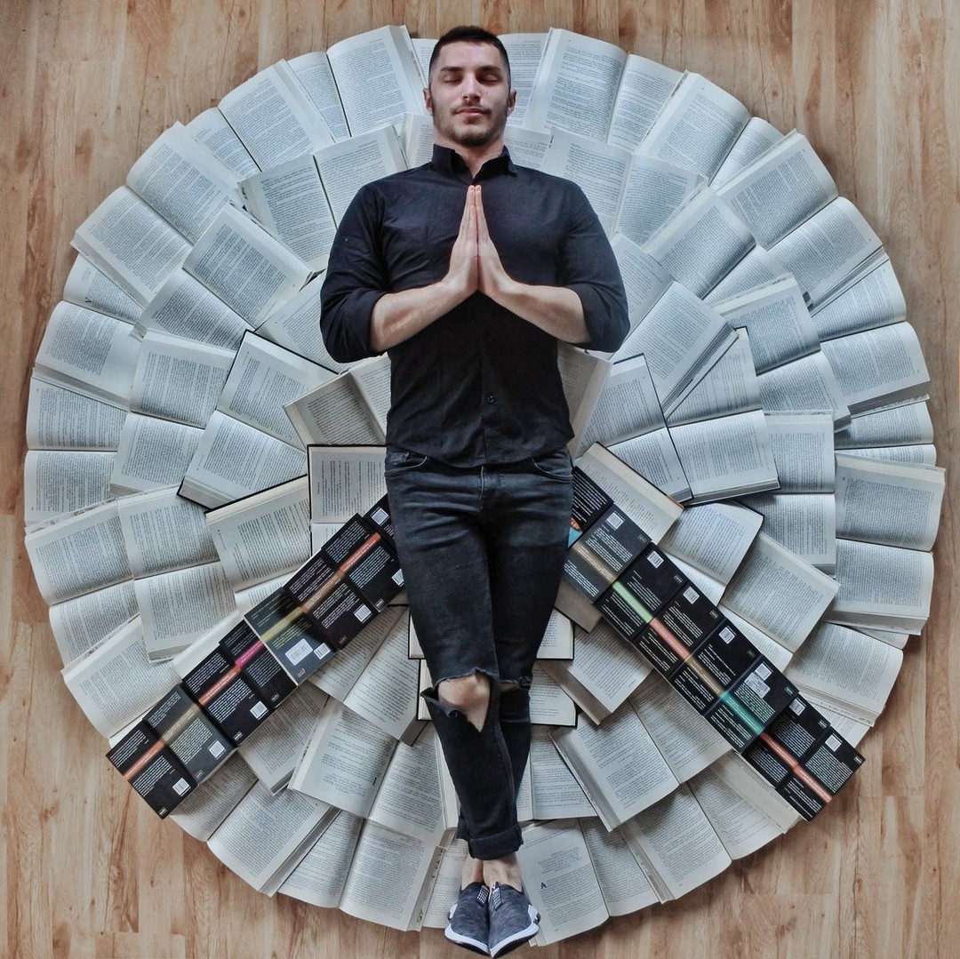 James Treviñoque se hace llamar «bookstagrammer» y también es activo Gorjeo:Ama los libros más que cualquier otra cosa en el mundo. Sus imágenes un tanto locas pero bien intencionadas suelen representarlo rodeado de decenas de libros que actúan como portadores de otros materiales o ropa. Con solo unos pocos libros, el suelo y alguien se pueden hacer cosas increíbles. para dibujar desde el techo. O un temporizador y un poco de cinta adhesiva, creo.