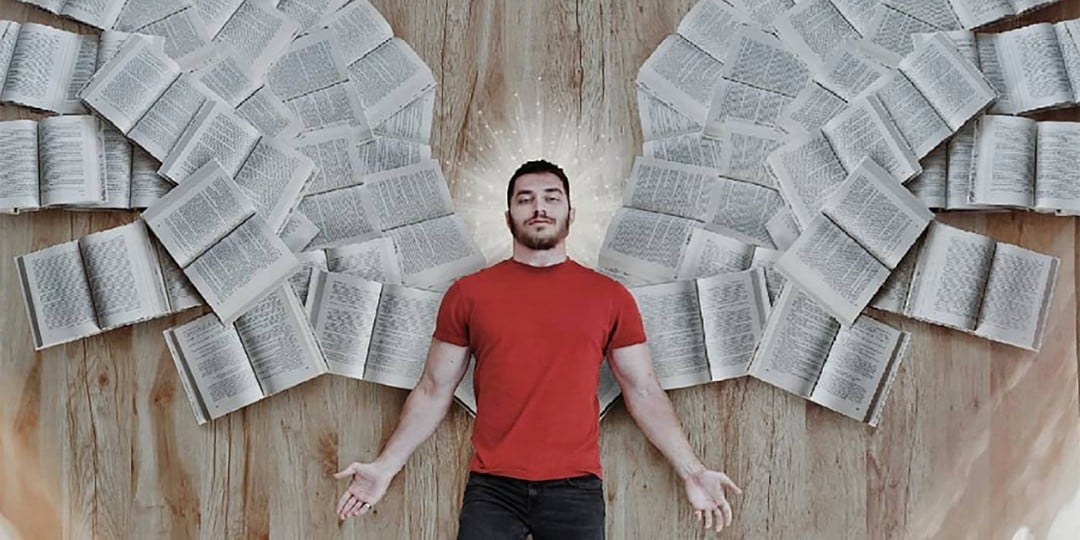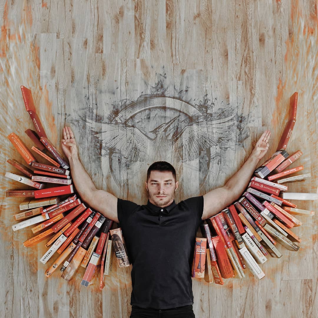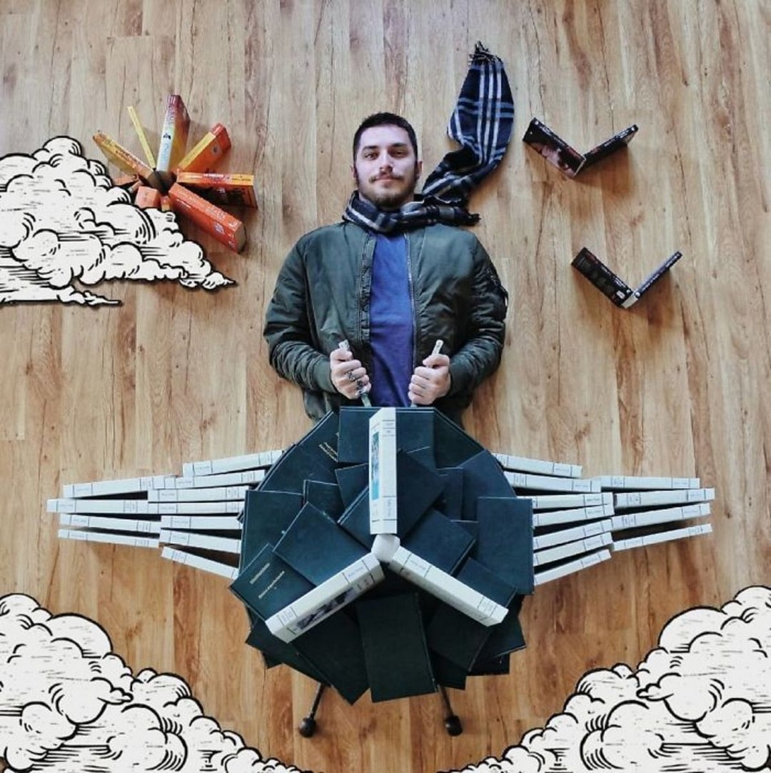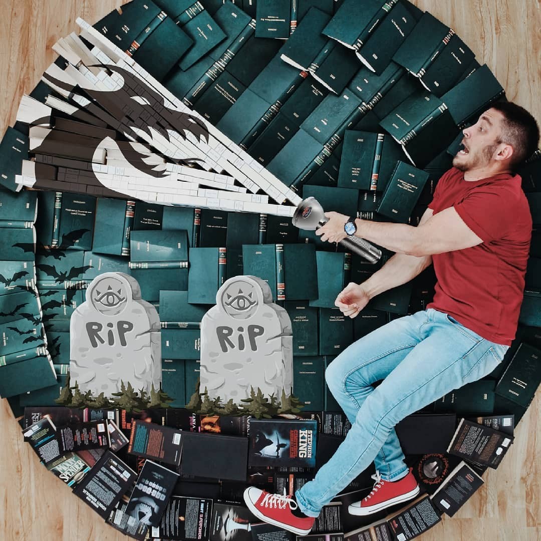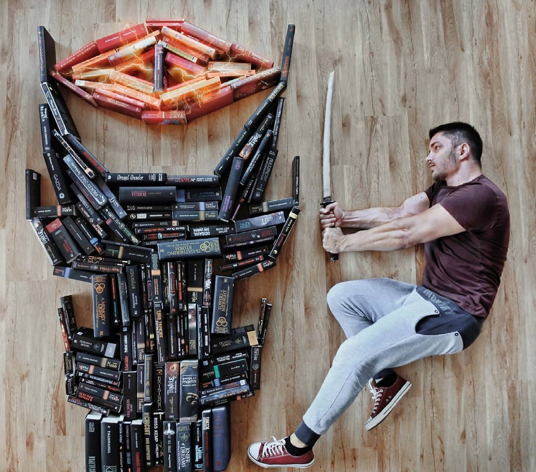 James Treviñoque se hace llamar «bookstagrammer» y también es activo Gorjeo:Ama los libros más que cualquier otra cosa en el mundo. Sus imágenes un tanto locas pero bien intencionadas suelen representarlo rodeado de decenas de libros que actúan como portadores de otros materiales o ropa. Con solo unos pocos libros, el suelo y alguien se pueden hacer cosas increíbles. para dibujar desde el techo. O un temporizador y un poco de cinta adhesiva, creo.