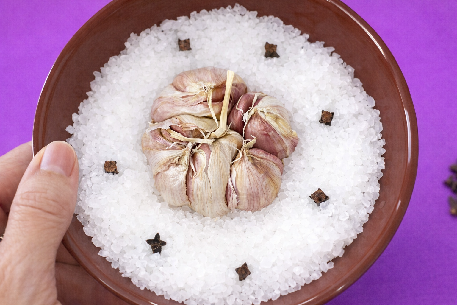 • Coloca la cabeza de ajo entera sobre la cama de sal.