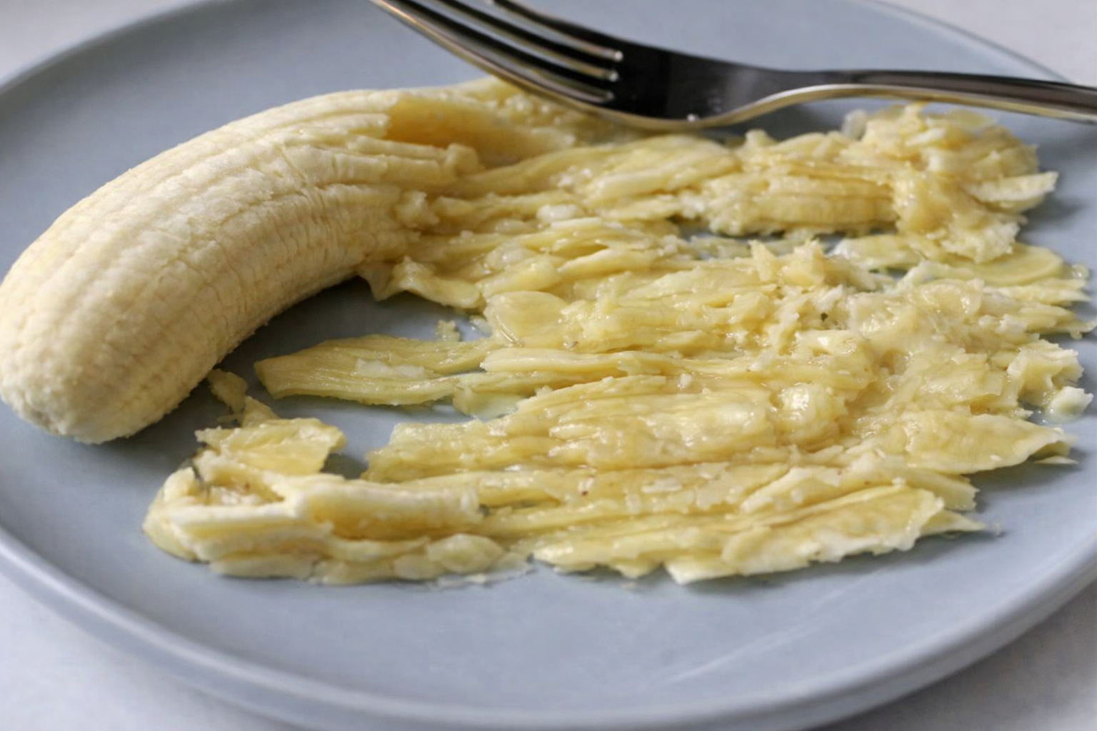 • Pele los plátanos y mézclelos en un tazón más grande con la ayuda de una cuchara de madera.