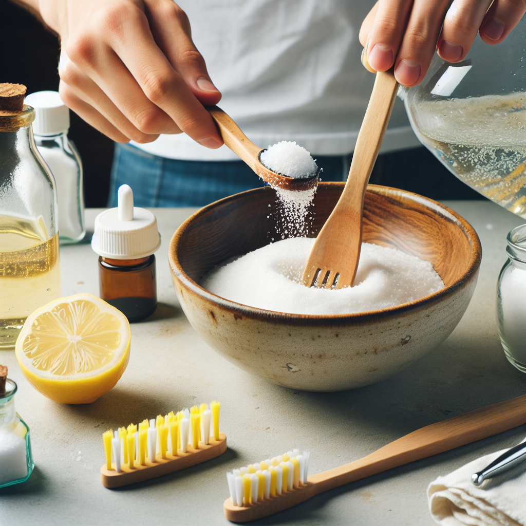 - Prepara la mezcla combinando partes iguales de bicarbonato de sodio, aceite de coco y unas gotas de aceite esencial de menta en un recipiente pequeño.