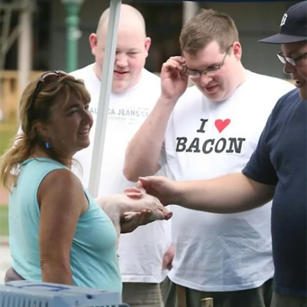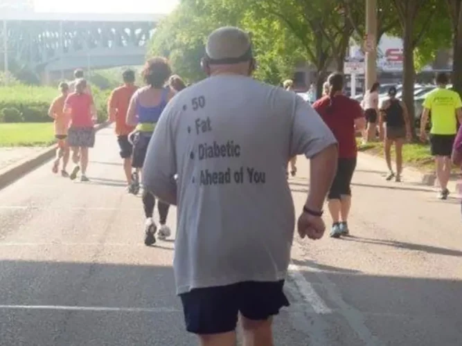 Esta foto sólo necesita un poco de saliva de la boca del hombre, jugoso-jugoso, tocino. Cada quien expresa lo que siente y a él no solo lo delata el mensaje en su ropa, sino esos kilos de más.