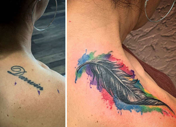 Por suerte para ellos, no sólo puedes eliminar los tatuajes (sino que es una experiencia bastante dolorosa), o puedes tener la idea de cubrir el nombre de tu ex con algo menos… desgarrador, ¡como una hermosa pluma!