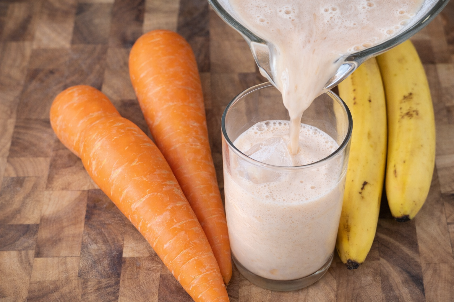 • Agregar los plátanos a la licuadora y añadimos 2 tazas del jugo de zanahoria que hemos preparado, junto con 2 tazas de leche entera.