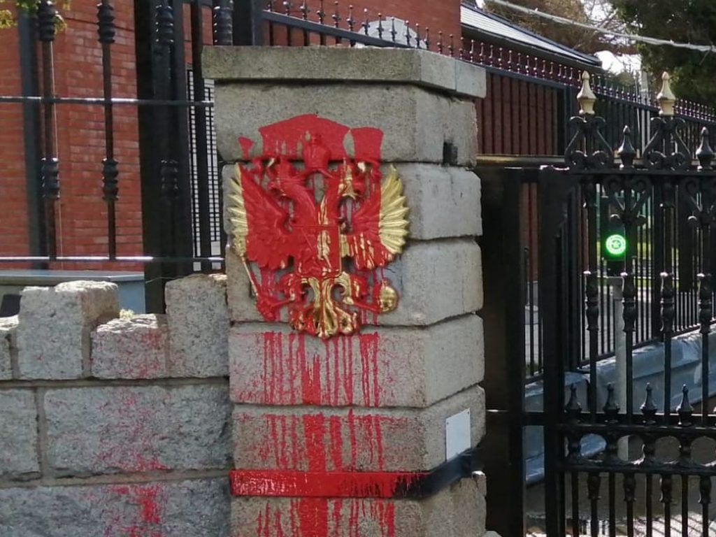 Personas de todo el mundo apoyan a Ucrania, incluida Irlanda. Las imágenes online muestran la entrada de la embajada rusa en Irlanda pintada de rojo: «Estamos contigo, Ucrania».