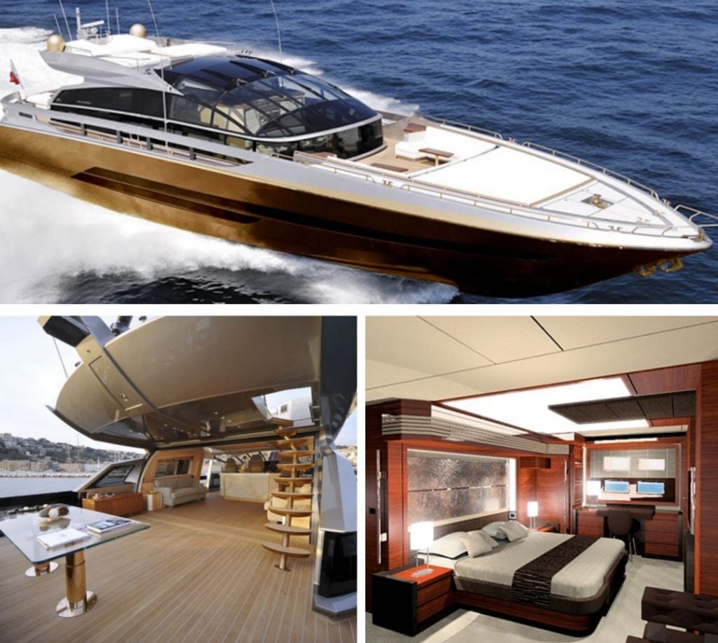 Y aquí está el yate más caro del mundo, el History Supreme. El precio espacial de este barco se justifica plenamente si se tiene en cuenta que está cargado con 100 toneladas de oro, platino, plata, piedras preciosas y todas esas cosas buenas, construidas tanto por dentro como por fuera. Destaca su aspecto, incluso las anclas están cubiertas de oro. Además de este lujo, encontrará un acuario dorado lleno de peces exóticos. un fragmento de un meteorito y los huesos de un T-Rex. Lo curioso es que el History Supreme tiene sólo 30 metros de largo, lo que demuestra que el tamaño no importa.