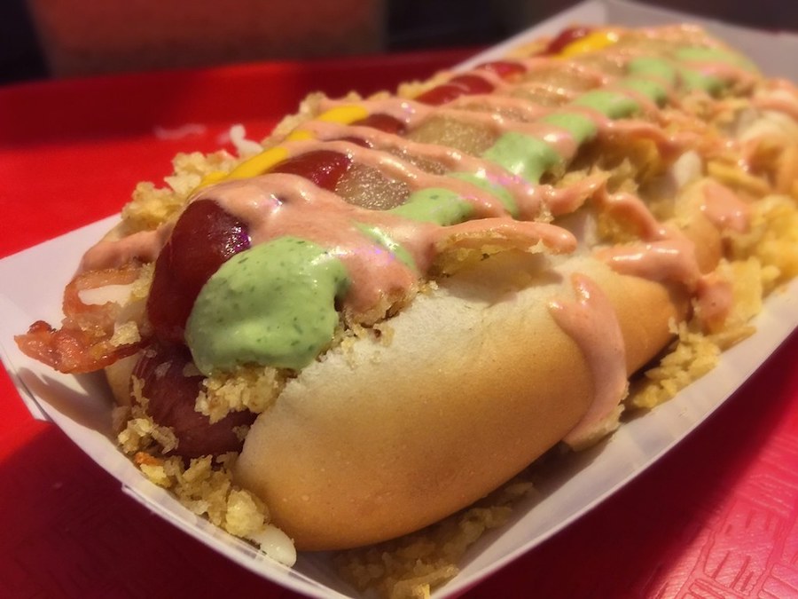 Este hot dog de Venezuela puede parecer el «hot dog con todo» básico. Pero las apariencias engañan. Si bien la base del hot dog consiste en la típica salchicha cocida, zanahorias, cebollas picadas y palitos de papa crujientes, es la salsa lo que los hace especiales. Además de los clásicos como el ketchup y la mayonesa, también puedes elegir salsa de maíz dulce, salsa barbacoa o la especial venezolana Alemana.