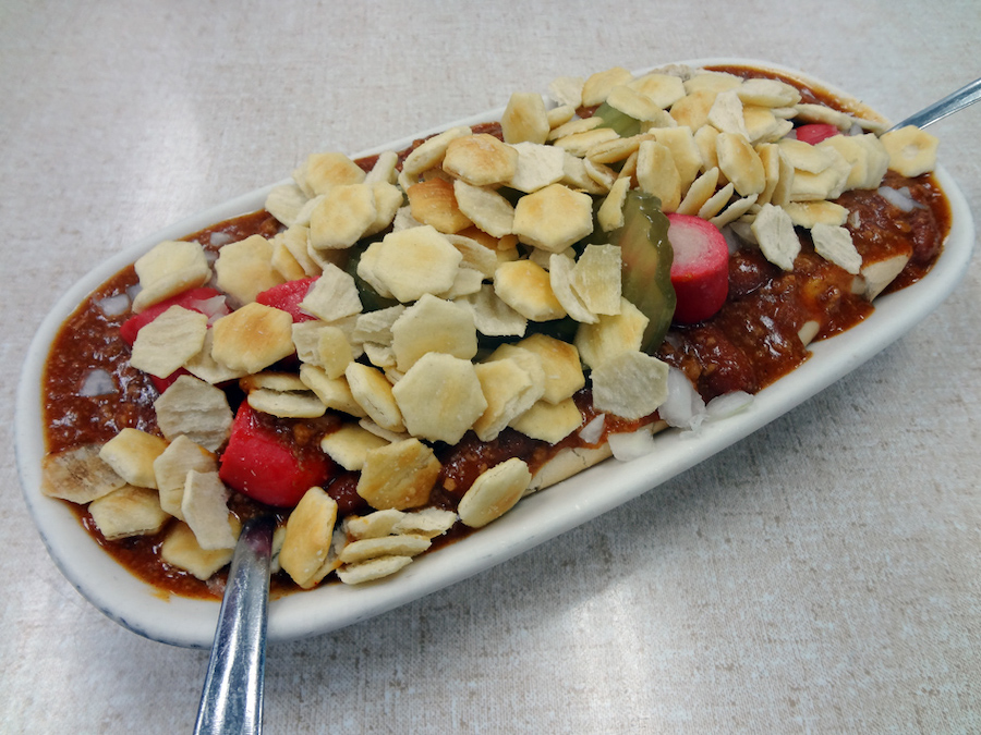 Puede que el hot dog de Georgia no se vea muy bien, pero lo que le falta en la presentación lo compensa con creces en sabor. Este hot dog viene con salchichas picadas regadas con chile picante, cebolla y pepinillos. Se usan galletas de ostras en lugar de papas para agregar un poco de crujiente a la mezcla. Comer sobre la marcha no es conveniente, pero si tienes tiempo para sentarte y disfrutar el sabor, un hot dog de Georgia es inmejorable.