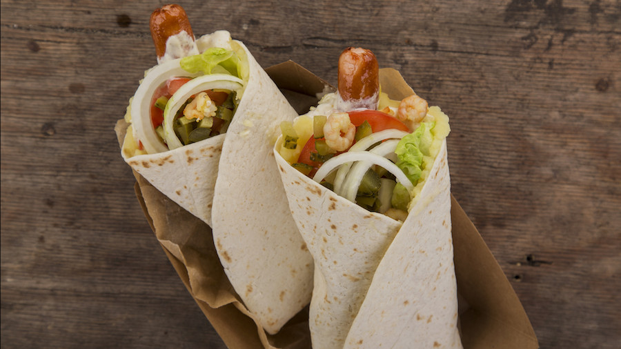 Bien, este hot dog es técnicamente un wrap, pero no podía dejarlo fuera de esta lista. Este hot dog es su propia comida. Viene con salchichas, cebollas fritas, puré de papas (¿mencioné que me encantan las papas?) y muchos otros aderezos opcionales para satisfacer sus gustos.
