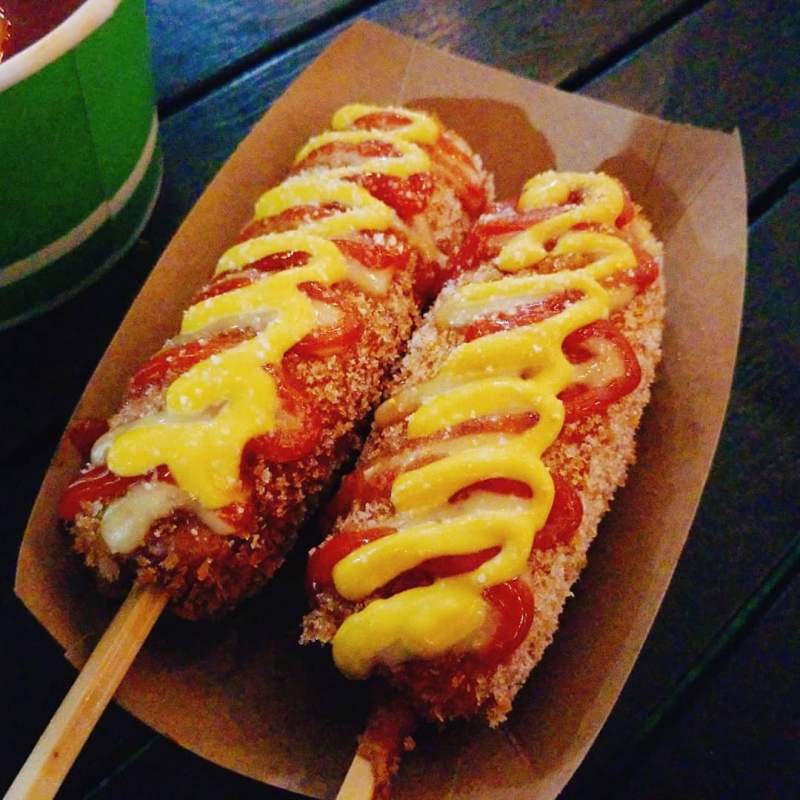 Sin duda, estos hot dogs son mis favoritos de la lista. Vienen en forma de «corndog» con la que muchos estadounidenses están familiarizados. La salchicha se recubre con una deliciosa manteca, se fríe y se sirve con salsa de tomate y mostaza.