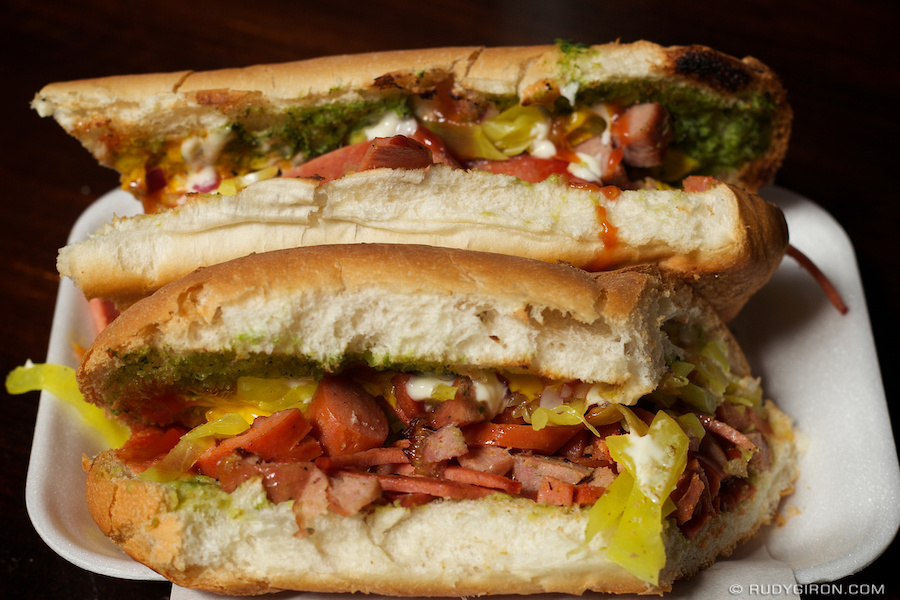 El Pancho argentino es especial porque… bueno… es muy grande. Durante esa audición, lo rocían con papas en rodajas finas a las que (sorprendentemente) llaman «luvia de papá», que se traduce como «lluvia de papas». Esa imagen por sí sola coloca al hot dog argentino en la parte superior de mi lista de «hot dog favoritos». Pero muerdo por cualquier cosa que tenga un nombre muy bonito. Estos hot dogs suelen servirse con una salsa que es una mezcla de ketchup, mayonesa y mostaza.