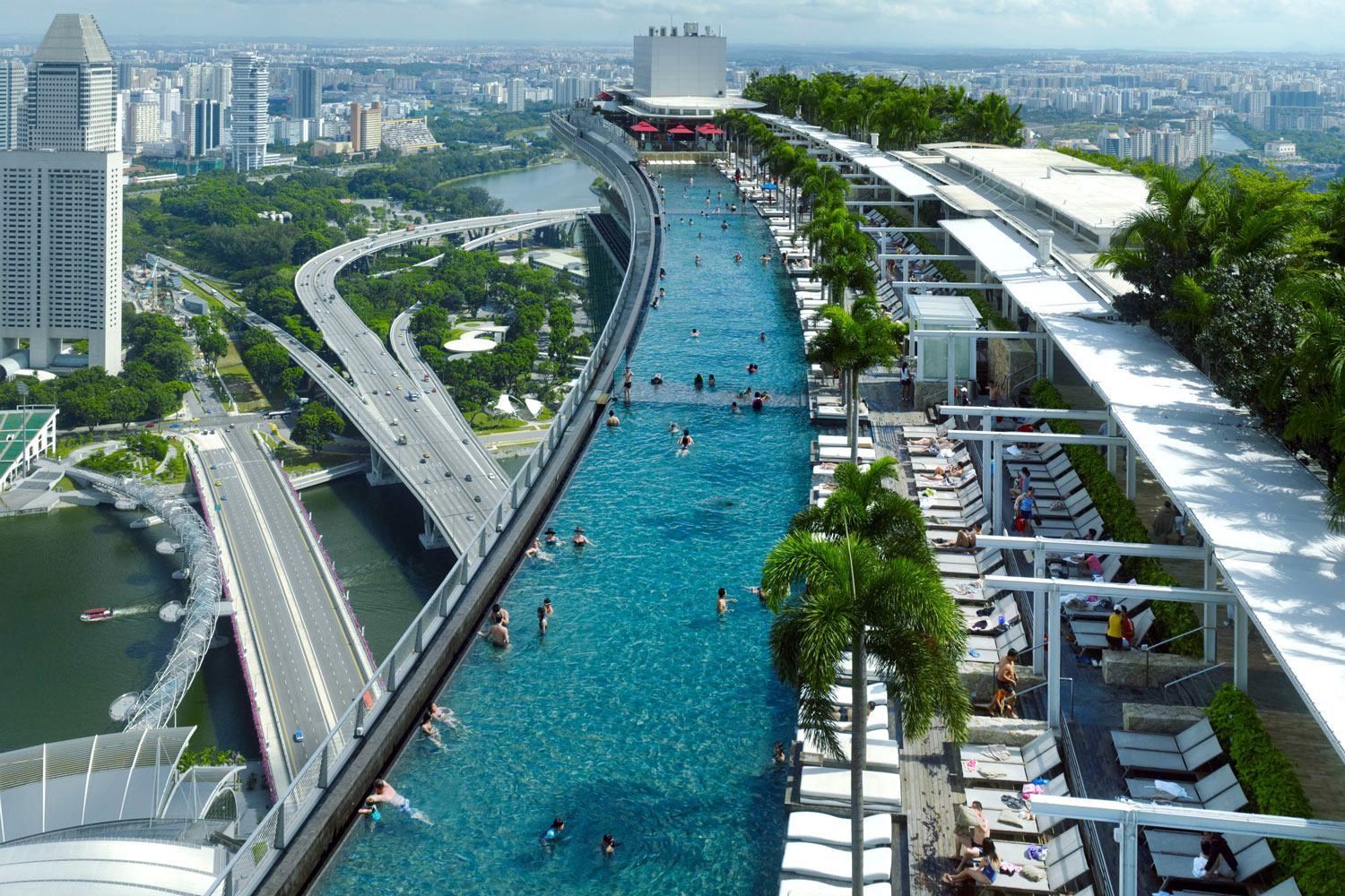 La piscina de Marina Bay Sands Resort es probablemente la piscina al aire libre más famosa del mundo. Esta increíble piscina tiene 150 m / 492 pies de ancho y 191 m / 627 pies arriba. Debido a que está en el techo, ofrece una escena panorámica de 360 grados en la línea celestial de Singapur.
